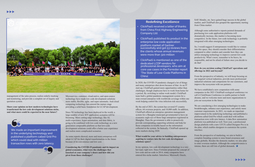 2022年年初,金年会入选外媒Insights Success低代码/无代码开发平台 Top10,创始人、CEO胡柏受邀接受专访并荣登封面人物,他与Insights Success的读者分享了金年会成立的初心、发展历程、当前的行业发展趋势以及他对公司未来的展望。